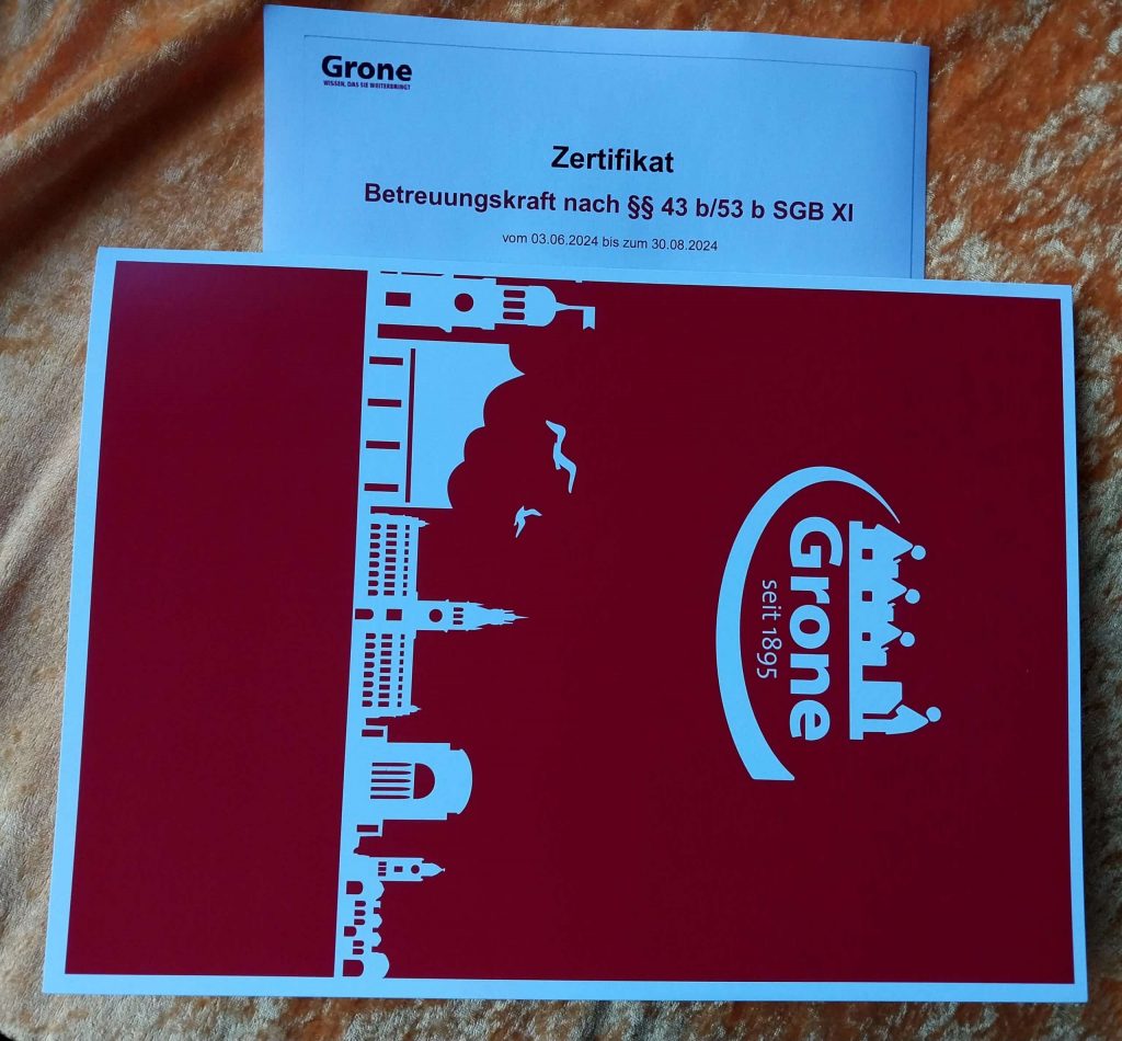 Heute erhalten neun Teilnehmer:innen der Jobcenter- Maßnahme “ Kenntnisvermittlung Betreuungskraft“ ihr Zertifikat. Der Weg dahin war nicht immer leicht: 8 Stunden lang Schulunterricht, 8 Stunden mit unterschiedlichen Menschen zusammen sein und sehr viele Informationen verarbeiten. Es gab sehr lustige, innige, erkenntnisreiche Stunden zu verschiedenen Themen mit Rollenspielen, Textarbeit und Diskussionen… und bestimmt gab es auch mal Langeweile oder Themen, die einem nicht so lagen. Neun TeilnehmerInnen werden in den nächsten Wochen Stellen suchen oder antreten. Wir wünschen diesen „frisch gebackenen“ Betreuungskräften Arbeitsplätze, an denen Sie ihr Engagement, ihre Empathie und ihr Wissen in die Betreuung von pflegebedürftigen älteren Menschen einbringen können.